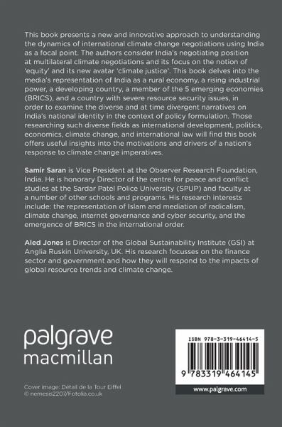 This book presents a new and innovative approach to understanding the dynamics of international climate change negotiations using India as a focal point. The authors consider India's negotiating position at multilateral climate negotiations and its focus on the notion of 'equity' and its new avatar 'climate justice'. This book delves into the media's representation of India as a rural economy, a rising industrial power, a developing country, a member of the 5 emerging economies (BRICS), and a country with severe resource security issues, in order to examine the diverse and at time divergent narratives on India's national identity in the context of policy formulation. Those researching such diverse fields as international development, politics, economics, climate change, and international law will find this book offers useful insights into the motivations and drivers of a nation's response to climate change imperatives.