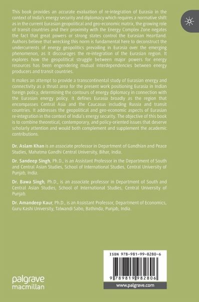 This book provides an accurate evaluation of re-integration of Eurasia in the context of India's energy security and diplomacy which requires a normative shift as in the current Eurasian geopolitical and geo-economic matrix, the growing role of transit countries and their proximity with the Energy Complex Zone negates the fact that great powers or strong states control the Eurasian Heartland. Authors believe that wrecking this norm is fundamental here to deconstruct the undercurrents of energy geopolitics prevailing in Eurasia over the emerging phenomenon, as it discourages the re-integration of the Eurasian region. It explores how the geopolitical struggle between major powers for energy resources has been engendering mutual interdependencies between energy producers and transit countries.