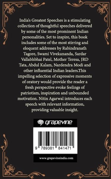 India's Greatest Speeches is a stimulating collection of thoughtful speeches delivered by some of the most prominent Indian personalities. Set to inspire, this book includes some of the most stirring and eloquent addresses by Rabindranath Tagore, Swami Vivekananda, Sardar Vallabhbhai Patel, Mother Teresa, JRD Tata, Abdul Kalam, Nardendra Modi and other influential Indian leaders. This impelling selection of expressive moments of oratory would provide the reader a fresh perspective evoke feelings of patriotism, inspiration and unbounded motivation. Nitin Agarwal introduces each speech with relevant information, providing valuable insight.