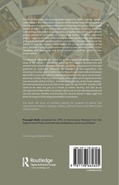 Making the right-wing Bharatiya Janata Party's nuclear tests in 1998 its starting point, this book examines how opinion amongst India's 'attentive' public shifted from supporting nuclear abstinence to accepting - and even feeling a need for - a more assertive policy, by examining the complexities of the debate in India on nuclear policy in the 1990s. The study seeks to account for the shift in opinion by looking at the parallel processes of how nuclear policy became an important part of the public discourse in India, and what it came to symbolise for the country's intelligentsia during this decade. It argues that the pressure on New Delhi in the early 1990s to fall in line with the non-proliferation regime, magnified by India's declining global influence at the time, caused the issue to cease being one of defence, making it a focus of nationalist pride instead. The country's nuclear programme thus emerged as a test of its ability to withstand external compulsions, guaranteeing not so much the sanctity of its borders as a certain political idea of it - that of a modern, scientific and, most importantly, 'sovereign' state able to defend its policies and set its goals.