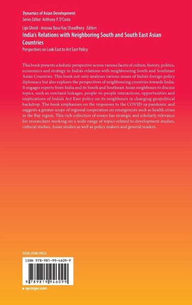Connecting Neighbors through ages: India's relations with South and Southeast Asia-Lipi.- India- Southeast Asian Relations & Cultural Interactions: A Past Profile - Lipi Ghosh.- The 'Look East Policy' of Bangladesh: An Opportunity for Building Complementary and Shared Development for Eastern South Asia.- Manifesting the South -East Asian Dream: Understanding the Bhutanese Perspective.- Nepal's drive for multi-modal connectivity.- BIMSTEC and India's 'Act East' Policy: Implications for Sri Lanka.- India's Act East Policy and Neighboring Powers: India-Myanmar Relations.- India's Act East - Thailand's Go West in the New World Order.- India-Malaysia Relations: Strategic Engagement in the context of the Act East Policy.- Singapore-India Relations: An Enduring Convergence of Interests.- Education and Knowledge-Based Economy in India in the Last Two Decades and some Suggestions to Vietnam.- India and Indonesia in the Indo-Pacific: Time for a Greater Push.- India's Act East Policy: China's Perceptions and Responses.- Strengthening Maritime connectivity across the Bay of Bengal: India and her Eastern and Southeastern Neighbors.- Regional Integration in the Bay of Bengal Region in Post-COVID-19 Period.