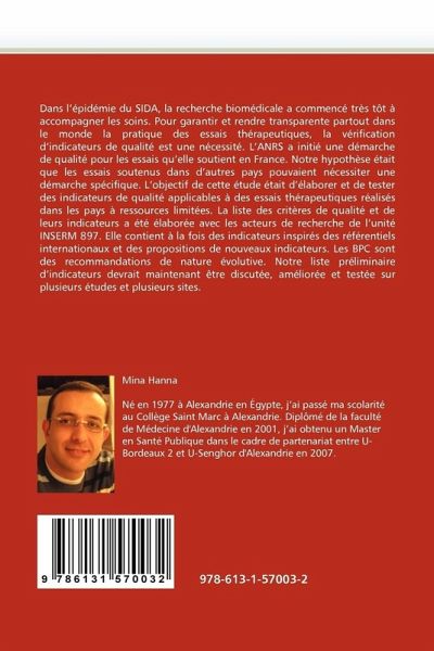 Dans l'épidémie du SIDA, la recherche biomédicale a commencé très tôt à accompagner les soins. Pour garantir et rendre transparente partout dans le monde la pratique des essais thérapeutiques, la vérification d'indicateurs de qualité est une nécessité. L'ANRS a initié une démarche de qualité pour les essais qu'elle soutient en France. Notre hypothèse était que les essais soutenus dans d'autres pays pouvaient nécessiter une démarche spécifique. L'objectif de cette étude était d'élaborer et de tester des indicateurs de qualité applicables à des essais thérapeutiques réalisés dans les pays à ressources limitées. La liste des critères de qualité et de leurs indicateurs a été élaborée avec les acteurs de recherche de l'unité INSERM 897. Elle contient à la fois des indicateurs inspirés des référentiels internationaux et des propositions de nouveaux indicateurs. Les BPC sont des recommandations de nature évolutive. Notre liste préliminaire d'indicateurs devrait maintenant être discutée, améliorée et testée sur plusieurs études et plusieurs sites.
