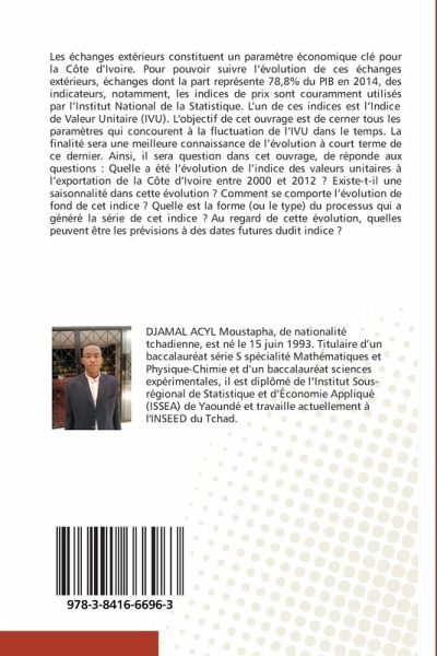 Les échanges extérieurs constituent un paramètre économique clé pour la Côte d'Ivoire. Pour pouvoir suivre l'évolution de ces échanges extérieurs, échanges dont la part représente 78,8% du PIB en 2014, des indicateurs, notamment, les indices de prix sont couramment utilisés par l'Institut National de la Statistique. L'un de ces indices est l'Indice de Valeur Unitaire (IVU). L'objectif de cet ouvrage est de cerner tous les paramètres qui concourent à la fluctuation de l'IVU dans le temps. La finalité sera une meilleure connaissance de l'évolution à court terme de ce dernier. Ainsi, il sera question dans cet ouvrage, de réponde aux questions : Quelle a été l'évolution de l'indice des valeurs unitaires à l'exportation de la Côte d'Ivoire entre 2000 et 2012 ? Existe-t-il une saisonnalité dans cette évolution ? Comment se comporte l'évolution de fond de cet indice ? Quelle est la forme (ou le type) du processus qui a généré la série de cet indice ? Au regard de cette évolution, quelles peuvent être les prévisions à des dates futures dudit indice ?