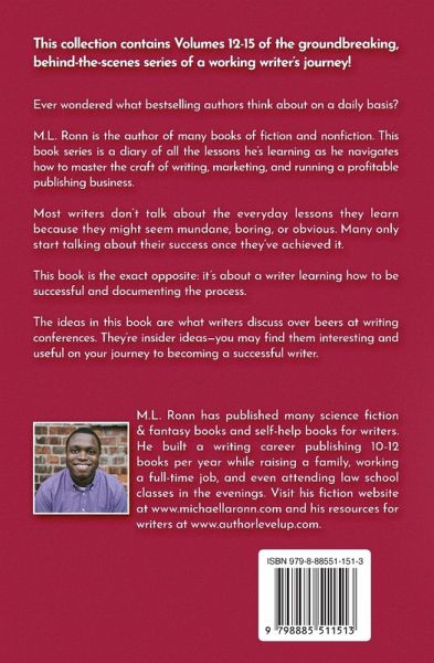 This collection contains Volumes 12-15 of the groundbreaking, behind-the-scenes series of a working writer's journey! Ever wondered what bestselling authors think about on a daily basis? M.L. Ronn is the author of many books of fiction and nonfiction. This book series is a diary of all the lessons he's learning as he navigates how to master the craft of writing, marketing, and running a profitable publishing business. Most writers don't talk about the everyday lessons they learn because they might seem mundane, boring, or obvious. Many only start talking about their success once they've achieved it. This book is the exact opposite: it's about a writer learning how to be successful and documenting the process. The ideas in this book are what writers discuss over beers at writing conferences. They're insider ideas-you may find them interesting and useful on your journey to becoming a successful writer. V1.0