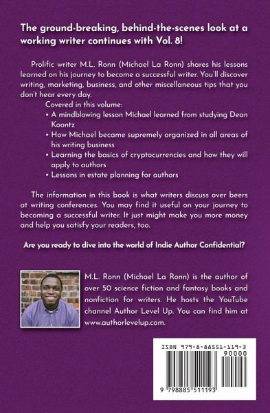 The ground-breaking, behind-the-scenes look at a working writer continues with Vol. 8! Prolific writer M.L. Ronn (Michael La Ronn) shares his lessons learned on his journey to become a successful writer. You'll discover writing, marketing, business, and other miscellaneous tips that you don't hear every day. Covered in this volume: ¿A mindblowing lesson Michael learned from studying Dean Koontz ¿How Michael became supremely organized in all areas of his writing business ¿Learning the basics of cryptocurrencies and how they will apply to authors ¿Lessons in estate planning for authors The information in this book is what writers discuss over beers at writing conferences. You may find it useful on your journey to becoming a successful writer. It just might make you more money and help you satisfy your readers, too. Are you ready to dive into the world of Indie Author Confidential? V1.0