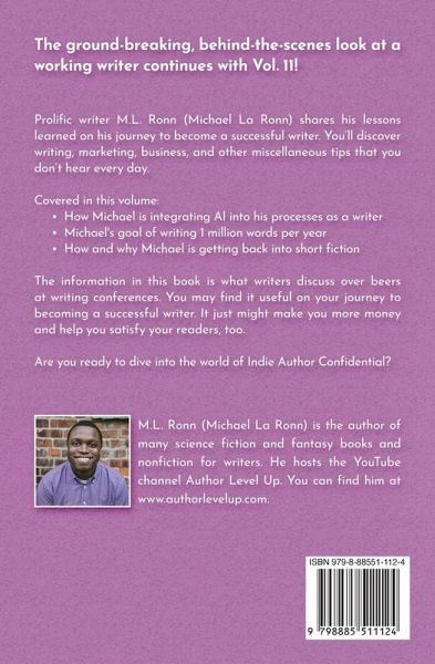 The ground-breaking, behind-the-scenes look at a working writer continues with Vol. 11! Prolific writer M.L. Ronn (Michael La Ronn) shares his lessons learned on his journey to become a successful writer. You'll discover writing, marketing, business, and other miscellaneous tips that you don't hear every day. Covered in this volume: ¿How Michael is integrating AI into his processes as a writer ¿Michael's goal of writing 1 million words per year ¿How and why Michael is getting back into short fiction The information in this book is what writers discuss over beers at writing conferences. You may find it useful on your journey to becoming a successful writer. It just might make you more money and help you satisfy your readers, too. Are you ready to dive into the world of Indie Author Confidential? V1.0