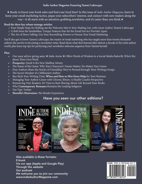 Ready to boost your book sales and find your loyal fans? In this issue of Indie Author Magazine, learn to hone your email marketing tactics, pique your subscribers' interest, and connect with new readers along the way-it all starts with an attention-grabbing newsletter, and it's easier than you think. Read three key articles: ¿ Four Simple Steps for Rolling out the Welcome Mat to Your Mailing List, with Guest Author Tammi Labrecque ¿ A Bolt from the Sendinblue: Unique Features that Set the Email Service Provider Apart ¿ The Art of Story-Selling: Use Your Storytelling Powers to Finesse Your Email Marketing You'll also get to know Tammi Labrecque, the master of email marketing who has taught more than twenty thousand authors the secrets to becoming a newsletter ninja. Read about what she's learned after almost a decade in the indie author world, plus learn top tips for perfecting your newsletter welcome sequence from Tammi herself. Plus:Our Sassy, Advice-Giving Aunt, ¿ Indie Annie ¿ Offers Words of Wisdom to a Social Media Butterfly Who's Shy about Their Own Work Prosperity: Email Is the New Mailbox Money The Name of the Game: Why Your Characters' Names Matter, No Matter Your Genre Four Authors Share the Stories of Friendship They've Penned through Their Writing Groups The Secret Mindset of a Millionaire Author Buy Back Your Writing Time: When and How to Hire Extra Help for Your Business Managing Your Author Career with Chronic Illness: A Health Coach's Perspective Romancing Your Readers: It's Time to Start Sharing About Life Beyond Your Books Why Contemporary Romance Remains the Leading Subgenre Ten Tips: Twitter Martelle's Motivation: The Reader Experience