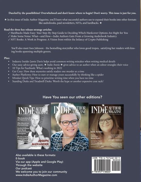 Indie Author Magazine: Featuring Ines JohnsonAudiobook Production Basics, NFT Books, Marketing Nonfiction, and Getting Cozy with MysteriesFor self-published authors, the future is now. Without the traditional roadblocks to publishing, it's now possible to take your intellectual property and expand your publishing universe to include not just e-books and paperbacks but also hardbacks, box sets, audiobooks, serialized newsletters, and even NFTs.Dazzled by the possibilities? Overwhelmed and don't know where to begin? Don't worry. This issue is just for you. ¿ In this issue of Indie Author Magazine, you'll learn what successful authors use to expand their books into other formats like audiobooks, paid newsletters, NFTs, and hardbacks.¿ Read three key articles: ¿ Hardbacks Made Easy: Your Step-By-Step Guide to Deciding Which Hardcover Options Are Right for Yoü Make Some Noise: What-and How-Indie Authors Gain From a Growing Audiobook Industry¿ NFT Books: A Work in Progress: A Vision from within the Infancy of Crypto PublishingYou'll also meet Ines Johnson - the bestselling storyteller who loves good tropes, satisfying her readers with kissing books spanning multiple genres.Plus:Industry Insider Jamie Davis helps avoid common writing mistakes when writing medical detailsWin the Short Game: How to Successfully Market NonFictionOur sassy advice-giving aunt, ¿ Indie Annie ¿ gives advice to an author when an editor strangles their voice10 Tips for Facebook: What's working in 2022 Get Cozy: How these mysteries satisfy readers one murder at a timeAuthor Platforms: How to start or manage yours successfully by thinking like a spider Mindset Quick Tips: How to prioritize writing time when you have no time Standing Desks and Treadmill Desks: Worth the hype or another expensive coat rack?
