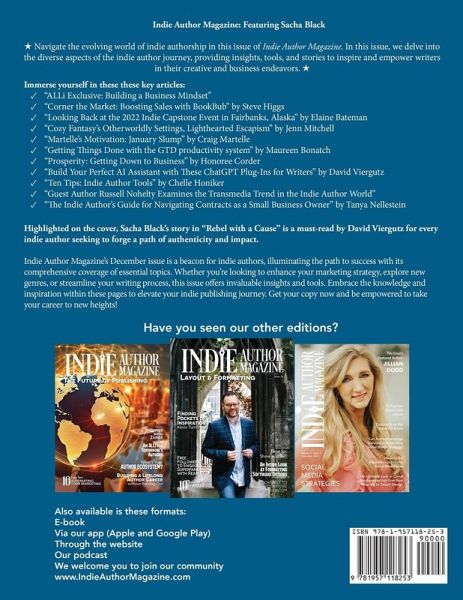¿ Navigate the evolving world of indie authorship in this issue of Indie Author Magazine. In this issue, we delve into the diverse aspects of the indie author journey, providing insights, tools, and stories to inspire and empower writers in their creative and business endeavors. Immerse yourself in these these key articles: ¿ "ALLi Exclusive: Building a Business Mindset" ¿ "Corner the Market: Boosting Sales with BookBub" by Steve Higgs ¿ "Looking Back at the 2022 Indie Capstone Event in Fairbanks, Alaska" by Elaine Bateman ¿ "Cozy Fantasy's Otherworldly Settings, Lighthearted Escapism" by Jenn Mitchell ¿"Martelle's Motivation: January Slump" by Craig Martelle ¿ "Getting Things Done with the GTD productivity system" by Maureen Bonatch ¿ "Prosperity: Getting Down to Business" by Honoree Corder ¿ "Build Your Perfect AI Assistant with These ChatGPT Plug-Ins for Writers" by David Viergutz ¿ "Ten Tips: Indie Author Tools" by Chelle Honiker ¿ "Guest Author Russell Nohelty Examines the Transmedia Trend in the Indie Author World" ¿ "The Indie Author's Guide for Navigating Contracts as a Small Business Owner" by Tanya Nellestein Highlighted on the cover, Sacha Black's story in "Rebel with a Cause" is a must-read by David Viergutz for every indie author seeking to forge a path of authenticity and impact. Indie Author Magazine's December issue is a beacon for indie authors, illuminating the path to success with its comprehensive coverage of essential topics. Whether you're looking to enhance your marketing strategy, explore new genres, or streamline your writing process, this issue offers invaluable insights and tools. Embrace the knowledge and inspiration within these pages to elevate your indie publishing journey.