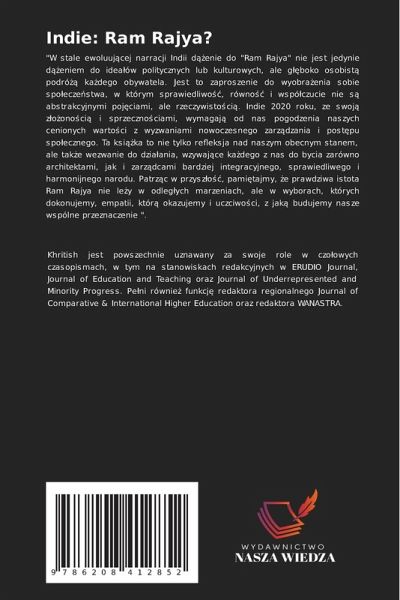 "W stale ewoluuj¿cej narracji Indii d¿¿enie do "Ram Rajya" nie jest jedynie d¿¿eniem do ideäów politycznych lub kulturowych, ale g¿¿boko osobist¿ podró¿¿ kädego obywatela. Jest to zaproszenie do wyobräenia sobie spo¿ecze¿stwa, w którym sprawiedliwo¿¿, równo¿¿ i wspó¿czucie nie s¿ abstrakcyjnymi poj¿ciami, ale rzeczywisto¿ci¿. Indie 2020 roku, ze swoj¿ z¿o¿ono¿ci¿ i sprzeczno¿ciami, wymagaj¿ od nas pogodzenia naszych cenionych warto¿ci z wyzwaniami nowoczesnego zarz¿dzania i post¿pu spo¿ecznego. Ta ksi¿¿ka to nie tylko refleksja nad naszym obecnym stanem, ale tak¿e wezwanie do dziäania, wzywaj¿ce kädego z nas do bycia zarówno architektami, jak i zarz¿dcami bardziej integracyjnego, sprawiedliwego i harmonijnego narodu. Patrz¿c w przysz¿o¿¿, pami¿tajmy, ¿e prawdziwa istota Ram Rajya nie le¿y w odleg¿ych marzeniach, ale w wyborach, których dokonujemy, empatii, któr¿ okazujemy i uczciwo¿ci, z jak¿ budujemy nasze wspólne przeznaczenie ".
