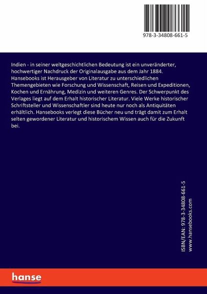 Indien - in seiner weltgeschichtlichen Bedeutung ist ein unveränderter, hochwertiger Nachdruck der Originalausgabe aus dem Jahr 1884.Hansebooks ist Herausgeber von Literatur zu unterschiedlichen Themengebieten wie Forschung und Wissenschaft, Reisen und Expeditionen, Kochen und Ernährung, Medizin und weiteren Genres. Der Schwerpunkt des Verlages liegt auf dem Erhalt historischer Literatur. Viele Werke historischer Schriftsteller und Wissenschaftler sind heute nur noch als Antiquitäten erhältlich. Hansebooks verlegt diese Bücher neu und trägt damit zum Erhalt selten gewordener Literatur und historischem Wissen auch für die Zukunft bei.