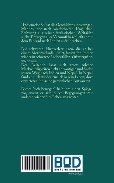 `Indienreise 84` ist die Geschichte eines jungen Mannes der nach wiederholten Unglücken, Befreiung aus seiner fatalistischen Weltsicht sucht. Entgegen aller Vernunft beschloss er mit dem Fahrrad nach Indien aufzubrechen. Die schweren Hirnverletzungen, die er bei einem Motorradunfall erlitt, lassen ihn immer wieder in schwarze Löcher fallen. Oft vergaß er wo er ist. Der Reisende lässt sich trotz solcher Merkwürdigkeiten nicht entmutigen und findet seinen Weg nach Indien und Nepal. In Nepal fand er auch wieder zurück in sein Leben, wo ihn seine persönlichen Antworten erwarten.Dieses "sich bewegen" hält ihm einen Spiegel vor, worin er sich durch Begegnungen mit anderen wieder fürs Leben ausrichtet.