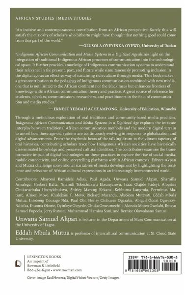 Foreword Des Wilson Acknowledgments Introduction: Des Wilson and the Enduring Legacy in Preserving African Indigenous Communication and Media Systems Unwana Samuel Akpan and Eddah Mbula Mutua Part I: Importance of African Indigenous Communication and Media Systems Chapter 1: Relevance of Des Wilson's African Indigenous Media Research Track in a Digitized Age Kehbuma Langmia Chapter 2: Examining the Impact of Digital Technology on African Indigenous Media in Botswana: A Potential Challenge to Sustainability/Longevity Shirley Marang Kekana Chapter 3: African Traditional Communication System in the Age of Hybridity: Habitual Media Customs and the Digital in the Nigerian Glocal Spaces Muhammad Hamisu Sani and Paul Obi Part II: Adaptation and Co-existence in the Digital Age Chapter 4: Communicating Emerging Science, Technology, and Innovation in Nigeria for Development in the Digital Age: Where Does Des Wilson's Trado-modern Media Come In? Herbert Batta Chapter 5: Ifa Divination, Extra-mundane Communication and Internet: An Overview Akinola Moses Owolabi, Bernice Oluwalaanu Sanusi, Oyinloye Oloyede, and Isaac Olajide Fadeyi Chapter 6: New Media Versus Traditional Media: 27 Years After Emergence of Internet in Nigeria Ibitayo Samuel Popoola and Paul Agada Chapter 7: African Language Media and BBC Yoruba Service Sports Headlines: Influence on Audience Engagement Online Unwana Samuel Akpan, Chuka Onwumechili, Abayomi Bamidele Adisa, and Abigail Odozi Ogwezzy-Ndisika Chapter 8: Egbe Bere Ugo Bere (Live and Let Live) Cultural Experiment as a Case Study on Igbo Traditional Public Relations Practice in Contemporary Digital Culture Nnamdi Tobechukwu Ekeanyanwu, Henry Chibueze Ogaraku, and Aloysius Chukwuebuka Ifeanyichukwu Part III: Enduring Relevance of African Indigenous Communication Systems in the Digital Age Chapter 9: Traditional Town Criers in Kenya and Nigeria: Enduring Relevance in the Digital Age Shamilla Amulega, Unwana Samuel Akpan, and Eddah Mbula Mutua Chapter 10: Nurturing Indigenous African Communication Modes in a Digital Age: Performing Igbo Proverbs in Film for Advice and Warning Ihuoma Okorie Chapter 11: Implications of the Two Step Flow Theory on Traditional Leadership in the Digital Age: The Case of Annang People in Akwa Ibom State in Nigeria Iniobong Courage Nda Chapter 12: Survival of Musical and Nonmusical Indigenous Namibian Media in the Digitized Age Perminus Matiure Chapter 13: Digital Technology in Breaking Information Barriers and the Preservation of Musical Arts in Zimbabwe Richard Muranda, Absolom Mutavati, Khulekani F. Moyo, and Almon Moyo Chapter 14: Vimbuza and Gule Wamkulu Traditional Dances as Enduring Malawian Indigenous Media Systems in the Digital Age Jerry Rutsate About the Contributors