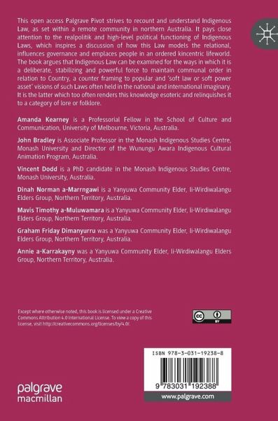 This Palgrave Pivot strives to recount and understand Indigenous Law, as set within a remote community in northern Australia. It pays close attention to the realpolitik and high-level political functioning of Indigenous Laws, which inspires a discussion of how this Law models the relational, influences governance and emplaces people in an ordered kincentric lifeworld. The book argues that Indigenous Law can be examined for the ways in which it is a deliberate, stabilizing and powerful force to maintain communal order in relation to Country, a counter framing to popular and 'soft law or soft power asset' visions of such Laws often held in the national and international imaginary. It is the latter which too often renders this knowledge esoteric and relinquishes it to a category of lore or folklore.