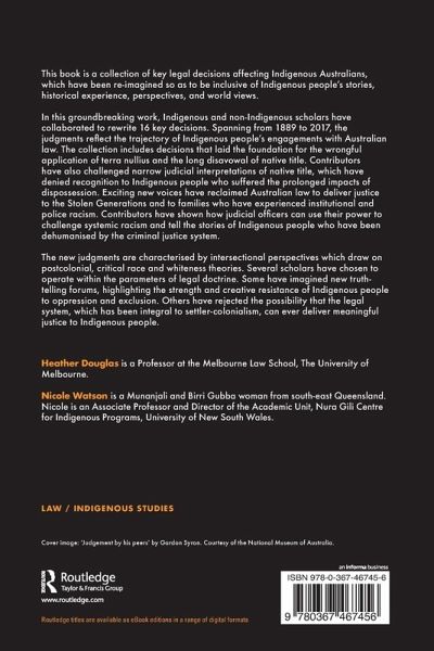 In this groundbreaking work, Indigenous and non-Indigenous scholars have collaborated to rewrite 16 key decisions. Spanning from 1889 to 2017, the judgments reflect the trajectory of Indigenous people's engagements with Australian law. The collection includes decisions that laid the foundation for the wrongful application of terra nullius and the long disavowal of native title. Contributors have also challenged narrow judicial interpretations of native title, which have denied recognition to Indigenous people who suffered the prolonged impacts of dispossession. Exciting new voices have reclaimed Australian law to deliver justice to the Stolen Generations and to families who have experienced institutional and police racism. Contributors have shown how judicial officers can use their power to challenge systemic racism and tell the stories of Indigenous people who have been dehumanised by the criminal justice system.