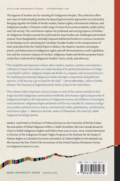 The legacies of borders are far-reaching for Indigenous Peoples. This collection offers new ways of understanding borders by departing from statist approaches to territoriality. Bringing together the fields of border studies, human rights, international relations, and Indigenous studies, it features a wide range of voices from across academia, public policy, and civil society. The contributors explore the profound and varying impacts of borders on Indigenous Peoples around the world and the ways borders are challenged and worked around. From Bangladesh's colonially imposed militarized borders to resource extraction in the Russian Arctic and along the Colombia-Ecuador border to the transportation of toxic pesticides from the United States to Mexico, the chapters examine sovereignty, power, and obstructions to Indigenous rights and self-determination as well as globalization and the economic impacts of borders. Indigenous Peoples and Borders proposes future action that is informed by Indigenous Peoples' voices, needs, and advocacy. Contributors. Tone Bleie, Andrea Carmen, Jacqueline Gillis, Rauna Kuokkanen, Elifuraha Laltaika, Sheryl Lightfoot, David Bruce MacDonald, Toa Elisa Maldonado Ruiz, Binalakshmi "Bina" Nepram, Melissa Z. Patel, Manoel B. do Prado Junior, Hana Shams Ahmed, Elsa Stamatopoulou, Liubov Suliandziga, Rodion Sulyandziga, Yifat Susskind, Erika M. Yamada