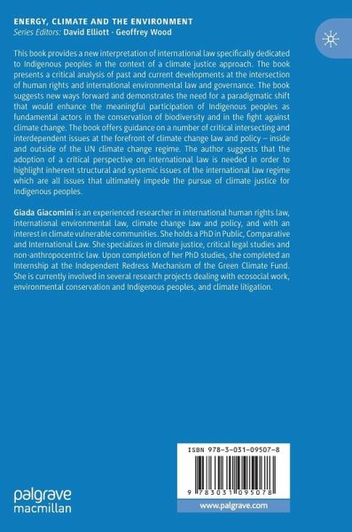 This book provides a new interpretation of international law specifically dedicated to Indigenous peoples in the context of a climate justice approach. The book presents a critical analysis of past and current developments at the intersection of human rights and international environmental law and governance. The book suggests new ways forward and demonstrates the need for a paradigmatic shift that would enhance the meaningful participation of Indigenous peoples as fundamental actors in the conservation of biodiversity and in the fight against climate change. The book offers guidance on a number of critical intersecting and interdependent issues at the forefront of climate change law and policy - inside and outside of the UN climate change regime. The author suggests that the adoption of a critical perspective on international law is needed in order to highlight inherent structural and systemic issues of the international law regime which are all issues that ultimately impede the pursue of climate justice for Indigenous peoples.
