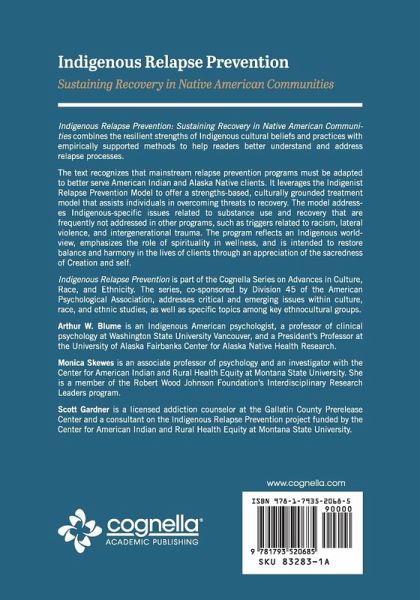 Indigenous Relapse Prevention: Sustaining Recovery in Native American Communities combines the resilient strengths of Indigenous cultural beliefs and practices with empirically supported methods to help readers better understand and address relapse processes. The text recognizes that mainstream relapse prevention programs must be adapted to better serve American Indian and Alaska Native clients. It leverages the Indigenist Relapse Prevention Model to offer a strengths-based, culturally grounded treatment model that assists individuals in overcoming threats to recovery. The model addresses Indigenous-specific issues related to substance use and recovery that are frequently not addressed in other programs, such as triggers related to racism, lateral violence, and intergenerational trauma. The program reflects an Indigenous worldview, emphasizes the role of spirituality in wellness, and is intended to restore balance and harmony in the lives of clients through an appreciation of the sacredness of Creation and self. Indigenous Relapse Prevention is part of the Cognella Series on Advances in Culture, Race, and Ethnicity. The series, co-sponsored by Division 45 of the American Psychological Association, addresses critical and emerging issues within culture, race, and ethnic studies, as well as specific topics among key multicultural groups.