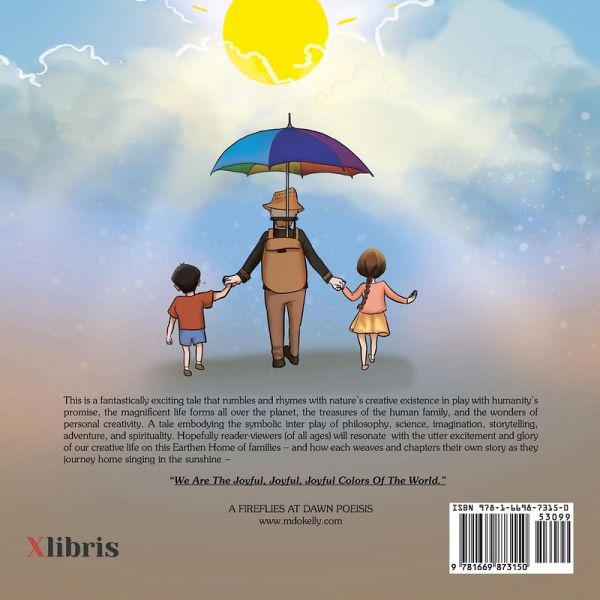 This is a fantastically exciting tale that rumbles and rhymes with nature's creative existence in play with humanity's promise, the magnificent life forms all over the planet, the treasures of the human family, and the wonders of personal creativity. A tale embodying the symbolic inter play of philosophy, science, imagination, storytelling, adventure, and spirituality. Hopefully reader-viewers (of all ages) will resonate with the utter excitement and glory of our creative life on this Earthen Home of families -- and how each weaves and chapters their own story as they journey home singing in the sunshine -- "We Are The Joyful, Joyful, Joyful Colors Of The World."