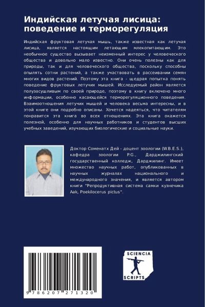 Indijskaq fruktowaq letuchaq mysh', takzhe izwestnaq kak letuchaq lisica, qwlqetsq nastoqschim letaüschim mlekopitaüschim. Jeto neobychnoe suschestwo wyzywaet neizmennyj interes u chelowecheskogo obschestwa i dowol'no malo izwestno. Oni ochen' polezny kak dlq prirody, tak i dlq chelowecheskogo obschestwa, poskol'ku sposobny opylqt' sotni rastenij, a takzhe uchastwowat' w rasseiwanii semqn mnogih widow rastenij. Poätomu äta kniga - schedraq popytka ponqt' powedenie fruktowyh letuchih myshej. Issleduemyj rajon qwlqetsq poluzasushliwym po swoej prirode, poätomu w knigu wklücheno mnogo informacii, osobenno kasaüschejsq termoregulqcionnogo powedeniq. Vzaimootnosheniq letuchih myshej i cheloweka wes'ma interesny, i w ätoj knige oni podrobno opisany. Hochetsq nadeqt'sq, chto chitatelqm ponrawitsq äta kniga wo wseh otnosheniqh. Jeta kniga okazhetsq poleznoj, osobenno dlq nauchnyh rabotnikow i studentow wysshih uchebnyh zawedenij, izuchaüschih biologicheskie i social'nye nauki.