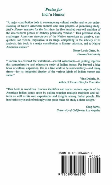 Drawing on history, psychology, folklore, linguistics, anthropology, and the arts, this book challenges "wooden Indian" stereotypes to redefine negative attitudes and humorless approaches to Native American peoples. Moving from tribal culture to interethnic literature, Lincoln explores such topics as the traditional Trickster of origin myths, historical ironies, Euroamericans "playing Indian", feminist Indian humor at home, contemporary painters and playwrights reinventing Coyote, popular mixed-blood music, and Red English. Lincoln turns to the texts of Native American authors including Louise Erdrich, James Welch, and N. Scott Momaday, to illustrate the rich tradition of Native American humor: a tradition that evolved as the result of and has survived in spite of a history of unconscionable suffering and sadness during the course of which ninety-seven percent of the native populations were destroyed. A study of the literary humor of poets like Paula Gunn Allen, Diane Burns, and Linda Hogan provides further evidence of the importance of the role of humor in Native American culture. Indi'n Humor documents and interprets the contexts of laughter among Native Americans, as they see and are seen by the rest of the world. The study comes to focus comically on the poets, visual artists, playwrights, and novelists who make up the cultural renaissance of the past twenty years. Focusing on ethnic humor, from jokes in bars and powwows, to intercultural politics, to literature, Indi'n Humor will enlighten and entertain readers interested in Native American culture, as well as scholars of Amen can and Ethnic Studies, and humor theorists.