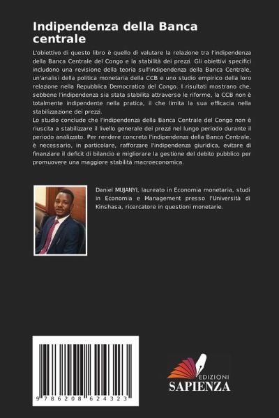 L'obiettivo di questo libro è quello di valutare la relazione tra l'indipendenza della Banca Centrale del Congo e la stabilità dei prezzi. Gli obiettivi specifici includono una revisione della teoria sull'indipendenza della Banca Centrale, un'analisi della politica monetaria della CCB e uno studio empirico della loro relazione nella Repubblica Democratica del Congo. I risultati mostrano che, sebbene l'indipendenza sia stata stabilita attraverso le riforme, la CCB non è totalmente indipendente nella pratica, il che limita la sua efficacia nella stabilizzazione dei prezzi.Lo studio conclude che l'indipendenza della Banca Centrale del Congo non è riuscita a stabilizzare il livello generale dei prezzi nel lungo periodo durante il periodo analizzato. Per rendere concreta l'indipendenza della Banca Centrale, è necessario, in particolare, rafforzare l'indipendenza giuridica, evitare di finanziare il deficit di bilancio e migliorare la gestione del debito pubblico per promuovere una maggiore stabilità macroeconomica.