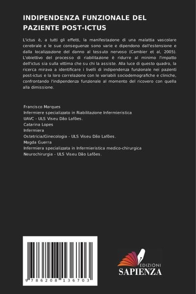 L'ictus è, a tutti gli effetti, la manifestazione di una malattia vascolare cerebrale e le sue conseguenze sono varie e dipendono dall'estensione e dalla localizzazione del danno al tessuto nervoso (Cambier et al, 2005). L'obiettivo del processo di riabilitazione è ridurre al minimo l'impatto dell'ictus sia sulla vittima che su chi la assiste. Alla luce di questo quadro, la ricerca mirava a identificare i livelli di indipendenza funzionale nei pazienti post-ictus e la loro correlazione con le variabili sociodemografiche e cliniche, confrontando l'indipendenza funzionale al momento del ricovero con quella alla dimissione.