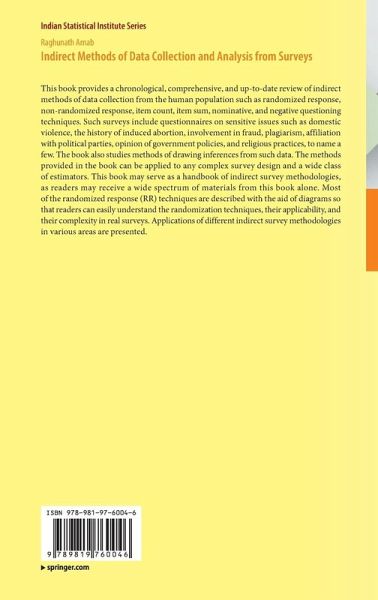 This book provides a chronological, comprehensive, and up-to-date review of indirect methods of data collection from the human population such as randomized response, non-randomized response, item count, item sum, nominative, and negative questioning techniques. Such surveys include questionnaires on sensitive issues such as domestic violence, the history of induced abortion, involvement in fraud, plagiarism, affiliation with political parties, opinion of government policies, and religious practices, to name a few. The book also studies methods of drawing inferences from such data. The methods provided in the book can be applied to any complex survey design and a wide class of estimators. This book may serve as a handbook of indirect survey methodologies, as readers may receive a wide spectrum of materials from this book alone. Most of the randomized response (RR) techniques are described with the aid of diagrams so that readers can easily understand the randomization techniques, their applicability, and their complexity in real surveys. Applications of different indirect survey methodologies in various areas are presented.
