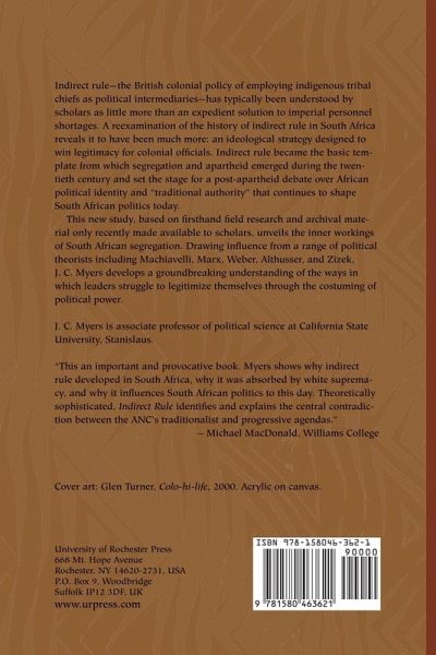 Indirect rule -- the British colonial policy of employing indigenous tribal chiefs as political intermediaries -- has typically been understood by scholars as little more than an expedient solution to imperial personnel shortages. A reexamination of the history of indirect rule in South Africa reveals it to have been much more: an ideological strategy designed to win legitimacy for colonial officials. Indirect rule became the basic template from which segregation and apartheid emerged during the twentieth century and set the stage for a post-apartheid debate over African political identity and "traditional authority" that continues to shape South African politics today. This new study, based on firsthand field research and archival material only recently made available to scholars, unveils the inner workings of South African segregation. Drawing influence from a range of political theorists including Machiavelli, Marx, Weber, Althusser, and Zizek, Myers develops a groundbreaking understanding of the ways in which leaders struggle to legitimize themselves through the costuming of political power. J. C. Myers is associate professor of political science at California State University, Stanislaus.