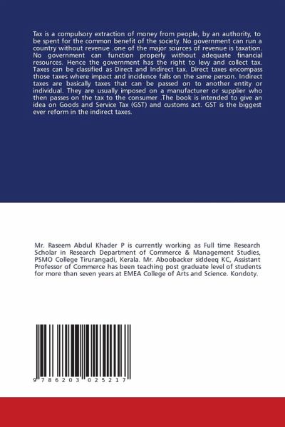Tax is a compulsory extraction of money from people, by an authority, to be spent for the common benefit of the society. No government can run a country without revenue .one of the major sources of revenue is taxation. No government can function properly without adequate financial resources. Hence the government has the right to levy and collect tax. Taxes can be classified as Direct and Indirect tax. Direct taxes encompass those taxes where impact and incidence falls on the same person. Indirect taxes are basically taxes that can be passed on to another entity or individual. They are usually imposed on a manufacturer or supplier who then passes on the tax to the consumer .The book is intended to give an idea on Goods and Service Tax (GST) and customs act. GST is the biggest ever reform in the indirect taxes.