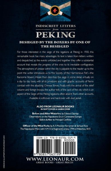 Besieged by the Boxers by one of the besieged For those interested in the siege of the legations at Peking in 1900, this remarkable book has many advantages. Its text is taken from letters written and despatched as the events unfolded and together they offer a substantial account that reveals the progress of the crisis to its inevitable conflagration. The atmosphere of unease within the city is palpable to the reader up to the point the writer introduces us to 'the Society of the Harmonious Fist'-the fearsome Boxers. Weale then describes the siege in some detail, virtually on a day by day basis, with all its privations and with graphic accounts of fierce combat with the attacking Chinese forces. Finally, with the arrival of the relief column and foreign troops, the author tells of the sack of the city which is an aspect of the Siege of the Peking legations often absent from other accounts. Available in softcover and hardcover with dust jacket.