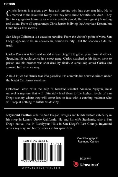 Chris Jensen is a great guy. Just ask anyone who has ever met him. He is married to the beautiful Kathy and they have three beautiful children. They live in a gorgeous house in an upscale neighborhood. He has a great job selling real estate. From all appearances Chris Jensen is living the American Dream, but Chris has a few secrets. San Diego California is a vacation paradise. From the visitor's point of view, San Diego appears to be an ultra-clean, crime-free city.but the shadows hide the truth. Carlos Perez was born and raised in San Diego. He grew up in those shadows. Spending his adolescence in a street gang, Carlos watched as his father went to prison and his brother was shot dead by rivals. A street cop saved Carlos and showed him a better way. A bold killer has struck fear into paradise. He commits his horrific crimes under the bright California sunshine. Detective Perez, with the help of forensic scientist Amanda Nguyen, must unravel a mystery that will ultimately lead them to the highest levels of San Diego society where they will come face-to-face with a cunning madman who will stop at nothing to fulfill his destiny.