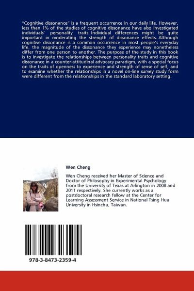 Cognitive dissonance is a frequent occurrence in our daily life. However, less than 1% of the studies of cognitive dissonance have also investigated individuals personality traits. Individual differences might be quite important in moderating the strength of dissonance effects. Although cognitive dissonance is a common occurrence in most people s everyday life, the magnitude of the dissonance they experience may nonetheless differ from one person to another. The purpose of the study in this book is to investigate the relationships between personality traits and cognitive dissonance in a counter-attitudinal advocacy paradigm, with a special focus on the traits of openness to experience and strength of sense of self, and to examine whether the relationships in a novel on-line survey study form were different from the relationships in the standard laboratory setting.