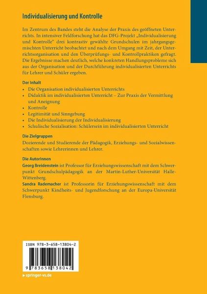 Im Zentrum des Bandes steht die Analyse der Praxis des geöffneten Unterrichts. In intensiver Feldforschung hat das DFG-Projekt "Individualisierung und Kontrolle" drei kontrastiv gewählte Grundschulen im jahrgangsgemischten Unterricht beobachtet und nach dem Umgang mit Zeit, der Unterrichtsorganisation und den Überprüfungs- und Kontrollpraktiken gefragt. Die Ergebnisse machen deutlich, welche konkreten Handlungsprobleme sich aus der Organisation und der Durchführung individualisierten Unterrichts für Lehrer und Schüler ergeben.