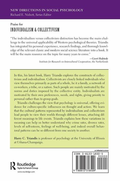 New Directions in Social Psychology -- Preface -- Introduction: Two Constructs -- Individualism and Collectivism in Philosophy and the Social Sciences -- Attributes of Individualism and Collectivism -- Antecedents and Geographic Distribution of Individualism and Collectivism -- Consequences of Individualism and Collectivism -- Applications: Training People to Work Well Together -- Evaluation of Individualism and Collectivism -- About the Book and Author -- Appendix: Measurement of Individualism and Collectivism