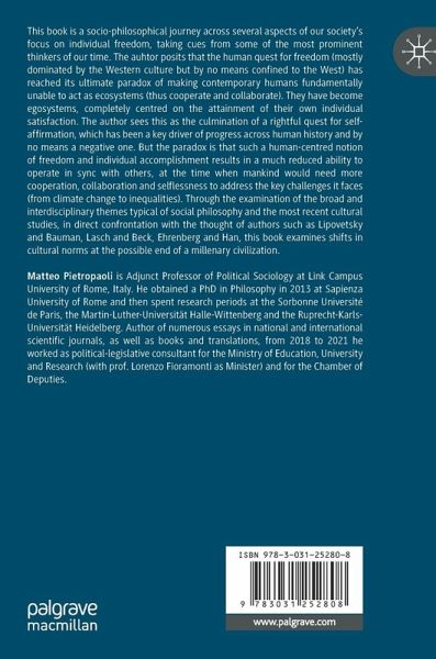 This book is a socio-philosophical journey across several aspects of our society's focus on individual freedom, taking cues from some of the most prominent thinkers of our time. The auhtor posits that the human quest for freedom (mostly dominated by the Western culture but by no means confined to the West) has reached its ultimate paradox of making contemporary humans fundamentally unable to act as ecosystems (thus cooperate and collaborate). They have become egosystems, completely centred on the attainment of their own individual satisfaction. The author sees this as the culmination of a rightful quest for self-affirmation, which has been a key driver of progress across human history and by no means a negative one. But the paradox is that such a human-centred notion of freedom and individual accomplishment results in a much reduced ability to operate in sync with others, at the time when mankind would need more cooperation, collaboration and selflessness to address the key challenges it faces (from climate change to inequalities). Through the examination of the broad and interdisciplinary themes typical of social philosophy and the most recent cultural studies, in direct confrontation with the thought of authors such as Lipovetsky and Bauman, Lasch and Beck, Ehrenberg and Han, this book examines shifts in cultural norms at the possible end of a millenary civilization.