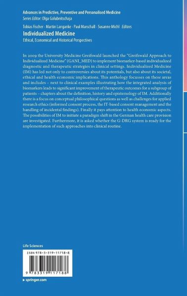 In 2009 the University Medicine Greifswald launched the "Greifswald Approach to Individualized Medicine" (GANI_MED) to implement biomarker-based individualized diagnostic and therapeutic strategies in clinical settings. Individualized Medicine (IM) has led not only to controversies about its potentials, but also about its societal, ethical and health economic implications. This anthology focusses on these areas and includes - next to clinical examples illustrating how the integrated analysis of biomarkers leads to significant improvement of therapeutic outcomes for a subgroup of patients - chapters about the definition, history and epistemology of IM. Additionally there is a focus on conceptual philosophical questions as well as challenges for applied research ethics (informed consent process, the IT-based consent management and the handling of incidental findings). Finally it pays attention to health economic aspects. The possibilities of IM to initiate a paradigm shift in the Germanhealth care provision are investigated. Furthermore, it is asked whether the G-DRG system is ready for the implementation of such approaches into clinical routine.