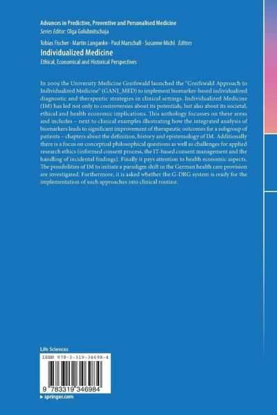 In 2009 the University Medicine Greifswald launched the "Greifswald Approach to Individualized Medicine" (GANI_MED) to implement biomarker-based individualized diagnostic and therapeutic strategies in clinical settings. Individualized Medicine (IM) has led not only to controversies about its potentials, but also about its societal, ethical and health economic implications. This anthology focusses on these areas and includes - next to clinical examples illustrating how the integrated analysis of biomarkers leads to significant improvement of therapeutic outcomes for a subgroup of patients - chapters about the definition, history and epistemology of IM. Additionally there is a focus on conceptual philosophical questions as well as challenges for applied research ethics (informed consent process, the IT-based consent management and the handling of incidental findings). Finally it pays attention to health economic aspects. The possibilities of IM to initiate a paradigm shift in the Germanhealth care provision are investigated. Furthermore, it is asked whether the G-DRG system is ready for the implementation of such approaches into clinical routine.