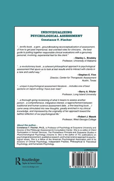 Assessments by psychologists, educators, and other human-service professionals too often end with the client being reported in terms of scores, bell-shaped curves, traits, psychodynamic forces, or diagnostic labels. Individualizing Psychological Assessment uses these classification devices in ways that facilitate returning from them to the individual's life, both during the assessment session and in written reports. The book presents an approach and procedures through which a person's actual life becomes the subject matter of assessment. Thoroughly revised from the previous edition, the book presents a wide range of concrete examples and illustrative cases that will serve both students and practicing professionals alike in individualizing assessments.