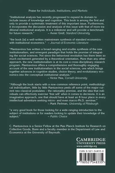 Individuals, Institutions, and Markets offers a theory of how the institutional framework of a society emerges and how markets within institutions work. The book shows that both social institutions, defined as the rules of the game, and exchange processes can be analyzed along a common theoretical structure. Mantzavinos' proposal is that a problem solving model of individual behavior inspired by the cognitive sciences provides such a unifying theoretical structure. Integrating the latest scholarship in economics, sociology, political science, law, and anthropology, Mantzavinos offers a genuine political economy showing how social institutions affect economic outcomes.