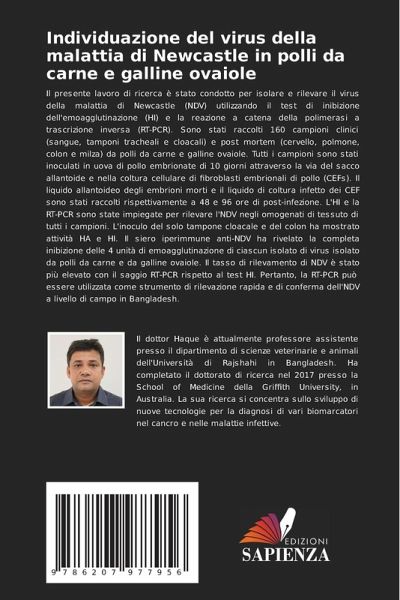 Il presente lavoro di ricerca è stato condotto per isolare e rilevare il virus della malattia di Newcastle (NDV) utilizzando il test di inibizione dell'emoagglutinazione (HI) e la reazione a catena della polimerasi a trascrizione inversa (RT-PCR). Sono stati raccolti 160 campioni clinici (sangue, tamponi tracheali e cloacali) e post mortem (cervello, polmone, colon e milza) da polli da carne e galline ovaiole. Tutti i campioni sono stati inoculati in uova di pollo embrionate di 10 giorni attraverso la via del sacco allantoide e nella coltura cellulare di fibroblasti embrionali di pollo (CEFs). Il liquido allantoideo degli embrioni morti e il liquido di coltura infetto dei CEF sono stati raccolti rispettivamente a 48 e 96 ore di post-infezione. L'HI e la RT-PCR sono state impiegate per rilevare l'NDV negli omogenati di tessuto di tutti i campioni. L'inoculo del solo tampone cloacale e del colon ha mostrato attività HA e HI. Il siero iperimmune anti-NDV ha rivelato la completa inibizione delle 4 unità di emoagglutinazione di ciascun isolato di virus isolato da polli da carne e da galline ovaiole. Il tasso di rilevamento di NDV è stato più elevato con il saggio RT-PCR rispetto al test HI. Pertanto, la RT-PCR può essere utilizzata come strumento di rilevazione rapida e di conferma dell'NDV a livello di campo in Bangladesh.