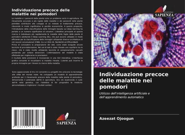 Le malattie e i parassiti delle piante sono un problema serio in agricoltura. Un rilevamento accurato e più rapido delle malattie e dei parassiti nelle piante potrebbe contribuire allo sviluppo di un metodo di trattamento precoce, riducendo in modo significativo le perdite economiche. A questo proposito, l'introduzione della classificazione delle immagini basata sul deep learning ha portato a un numero significativo di soluzioni. L'obiettivo principale di questa ricerca è individuare più rapidamente le malattie delle foglie delle piante di pomodoro adottando il Deep Learning (DL), che può essere utilizzato in modo efficiente per la classificazione delle immagini utilizzando diverse architetture di reti neurali convoluzionali (CNN), tra cui VGG-16, ResNet34 ed EfficentNet0.Prima di concludere la preparazione dei dati, sono state eseguite alcune tecniche di pre-elaborazione. Nel set di dati è stato rilevato uno squilibrio tra le classi, che è stato risolto utilizzando tecniche di campionamento casuale ponderato per evitare distorsioni. L'ottimizzazione del modello è stata effettuata per migliorarne le prestazioni.Il risultato delle previsioni è incorporato in una GUI interattiva. L'interfaccia grafica consente di visualizzare la malattia rilevata. L'utente può inserire la propria immagine per rilevare la classe della malattia.