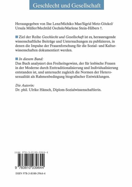 Ziel der Reihe ,Geschlecht und Gesellschaft` ist es, herausragende wissenschaftliche Beiträge und Untersuchungen zu publizieren, in denen die Impulse der Frauenforschung für die Sozial- und Kulturwissenschaften dokumentiert werden. In diesem Band: Das Buch analysiert den Freiheitsgewinn, der für lesbische Frauen in der Moderne durch Enttraditionalisierung und Individualisierung entstanden ist, und untersucht zugleich die Normen der Heterosexualität als Rahmenbedingung biographischer Entwicklungen.