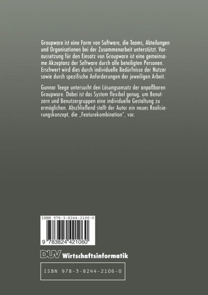 Groupware ist eine Form von Software, die Teams, Abteilungen und Organisationen bei der Zusammenarbeit unterstützt. Voraussetzung für den Einsatz von Groupware ist eine gemeinsame Akzeptanz der Software durch alle beteiligten Personen. Erschwert wird dies durch individuelle Bedürfnisse der Nutzer sowie durch spezifische Anforderungen der jeweiligen Arbeit. Gunnar Teege untersucht den Lösungsansatz der anpaßbaren Groupware. Dabei ist das System flexibel genug, um Benutzern und Benutzergruppen eine individuelle Gestaltung zu ermöglichen. Abschließend stellt der Autor ein neues Realisierungskonzept, die "Featurekombination", vor.