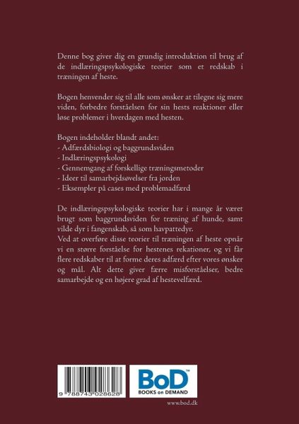 Indlæringspsykologi for hest og rytter giver dig en grundig introduktion til brug af de indlæringspsykologiske teorier som et redskab i træningen af heste. Bogen henvender sig til alle som ønsker at tilegne sig mere viden, forbedre forståelsen for sin hests reaktioner eller løse problemer i hverdagen med hesten. Bogen indeholder blandt andet: - Adfærdsbiologi og baggrundsviden - Indlæringspsykologi - Gennemgang af forskellige træningsmetoder - Ideer til samarbejdsøvelser fra jorden - Eksempler på cases med problemadfærd De indlæringspsykologiske teorier har i mange år været brugt som baggrundsviden for træning af hunde, samt en række vilde dyr i fangenskab, så som diverse havpattedyr. Ved at overføre disse teorier til træningen af heste opnår vi en større forståelse for hvorfor hestene reagerer som de gør, og vi får flere redskaber til at forme deres adfærd efter vores ønsker og mål. Alt dette giver færre misforståelser, bedre samarbejde og en højere grad af hestevelfærd.