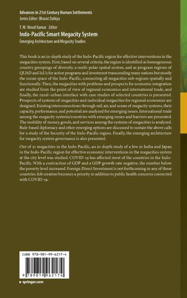 This book is an in-depth study of the Indo-Pacific region for effective interventions in the megacities system. First, based on several criteria, the region is identified as homogeneous country groupings of diversity, a multi-polar spatial system, and as program regions of QUAD and I2U2 for action programs and investment transcending many nations but mostly the ocean space of the Indo-Pacific, connecting all megacities sub-regions spatially and functionally. Then, the megacities with problems and prospects for economic integration are studied from the point of view of regional economics and international trade, and finally, the rural-urban interface with case studies of selected countries is presented. Prospects of systems of megacities and individual megacities for regional economies are designed. Existing interconnections through rail, air, and ocean of megacity systems, their capacity, performance, and potential are analyzed for emerging issues. International trade among the megacity systems/countries with emerging issues and barriers are presented. The mobility of money, goods, and services among the systems of megacities is analyzed. Rule-based diplomacy and other emerging options are discussed to sustain the above calls for a study of the Security of the Indo-Pacific region. Finally, the emerging architecture for megacity system governance is also presented.