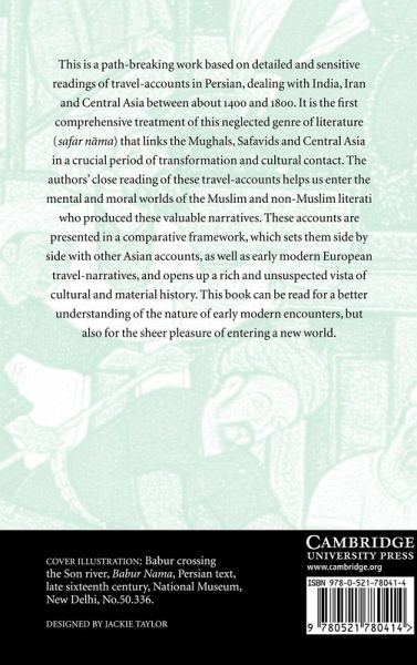 A groundbreaking work based on detailed and sensitive readings of travel accounts in Persian, dealing with India, Iran, and Central Asia between about 1400 and 1800. This is the first comprehensive treatment of this neglected genre of literature (safar nama) that links the Mughals, Safavids and Central Asia in a crucial period of transformation and cultural contact. The authors' close reading of these travel-accounts help us enter the mental and moral worlds of the Muslim and non-Muslim literati who produced these valuable narratives. These accounts are presented in a comparative framework, which sets them side by side with other Asian accounts, as well as early modern European travel-narratives, and opens up a rich and unsuspected vista of cultural and material history. This book can be read for a better understanding of the nature of early modern encounters, but also for the sheer pleasure of entering a new world.