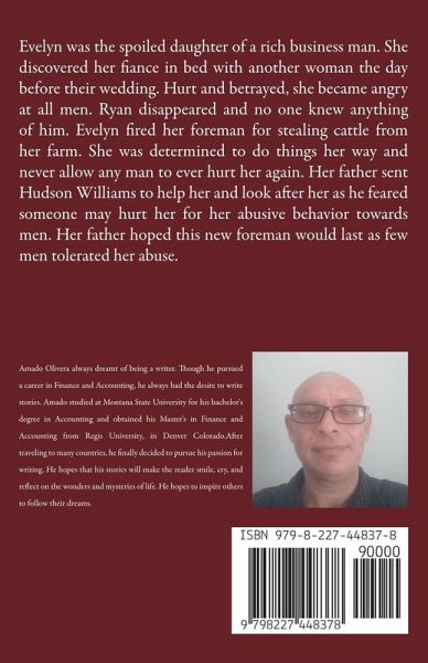 Evelyn was the spoiled daughter of a rich business man. She discovered her fiance in bed with another woman the day before their wedding. Hurt and betrayed, she became angry at all men. Ryan disappeared and no one knew anything of him. Evelyn fired her foreman for stealing cattle from her farm. She was determined to do things her way and never allow any man to ever hurt her again. Her father sent Hudson Williams to help her and look after her as he feared someone may hurt her for her abusive behavior towards men. Her father hoped this new foreman would last as few men tolerated her abuse.