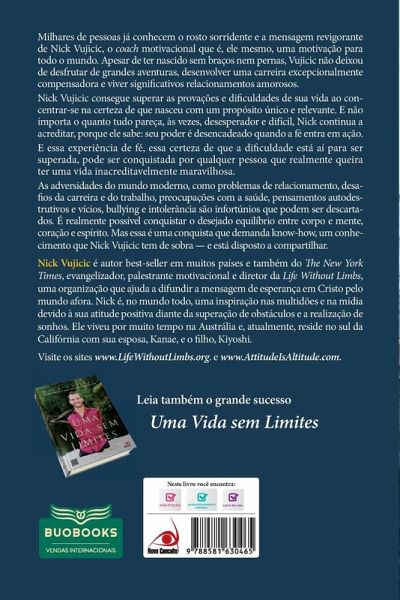 Você já se perguntou: por que comigo? Este livro o fará perguntar: e por que não comigo? Os vídeos e palestras de Nick Vujicic já foram assistidas por milhões de pessoas em todo o mundo. Uma história sobre acreditar e conseguir. Sobre saber a que veio - e ultrapassar seus limites. Milhares de pessoas já conhecem o rosto sorridente e a mensagem revigorante de Nick Vujicic, o coach motivacional que é, ele mesmo, uma motivação para todo o mundo. Apesar de ter nascido sem braços nem pernas, Vujicic não deixou de desfrutar de grandes aventuras, desenvolver uma carreira excepcionalmente compensadora e viver significativos relacionamentos amorosos. Nick Vujicic consegue superar as provações e dificuldades de sua vida ao concentrar-se na certeza de que nasceu com um propósito único e relevante. E não importa o quanto tudo pareça, às vezes, desesperador e difícil, Nick continua a acreditar, porque ele sabe: seu poder é desencadeado quando a fé entra em ação. E essa experiência de fé, essa certeza de que a dificuldade está aí para ser superada, pode ser conquistada por qualquer pessoa que realmente queira ter uma vida inacreditavelmente maravilhosa. As adversidades do mundo moderno como: Problemas de relacionamento; desafios da carreira e do trabalho; Preocupações com a saúde; Pensamentos autodestrutivos e vícios; Bullying e intolerância podem ser evitadas.