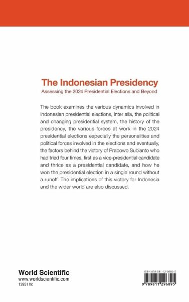 The book examines the various dynamics involved in Indonesian presidential elections, inter alia, the political and changing presidential system, the history of the presidency, the various forces at work in the 2024 presidential elections especially the personalities and political forces involved in the elections and eventually, the factors behind the victory of Prabowo Subianto who had tried four times, first as a vice-presidential candidate and thrice as a presidential candidate, and how he won the presidential election in a single round without a runoff. The implications of this victory for Indonesia and the wider world are also discussed.